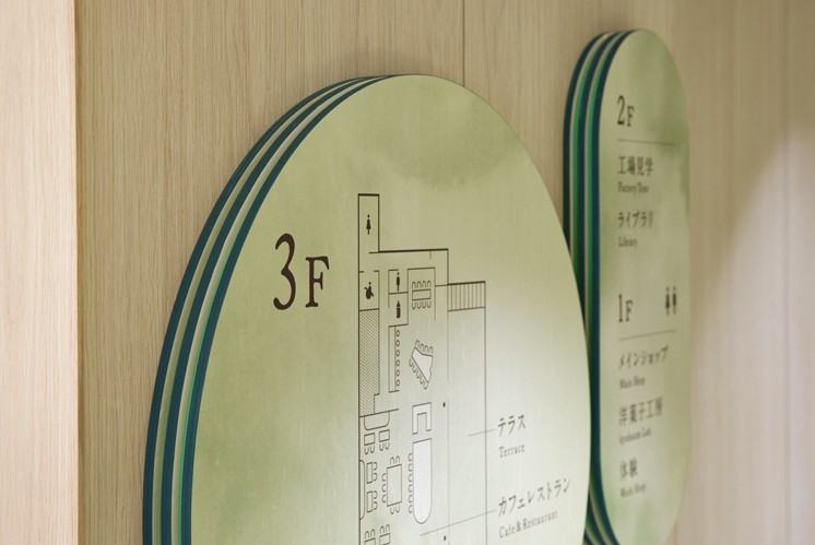 【京ばあむ博物館】標識設計:以年輪蛋糕的同心圓結構及綠色為標識基調