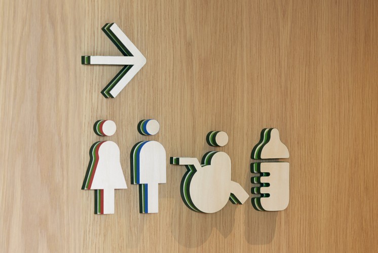 清晰的圖形符號(如衛生間指示中的男女、無障礙、母嬰標識 ),讓訪客在空間中能高效識別路徑、獲取信息,提升游覽體驗。這種設計,讓標識不再是冰冷的導視工具,而是能講述品牌故事、傳遞品牌溫度,又兼具實用價值的空間元素,使訪客踏入博物館起,便沉浸于「京ばあむ」營造的獨特品牌氛圍,感受自然、工藝與人文融合之美。