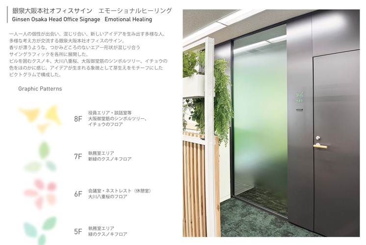 銀泉大阪總部辦公室導視系統《情感療愈》,以 促進多元人群與思維交流,催生創意新生為核心目標,錨定 縹緲香氣的靈感與 新生萌芽的主題,通過色彩、形態與空間觀感的精妙設計,將 療愈感深度融入辦公導視的功能性與藝術性中。