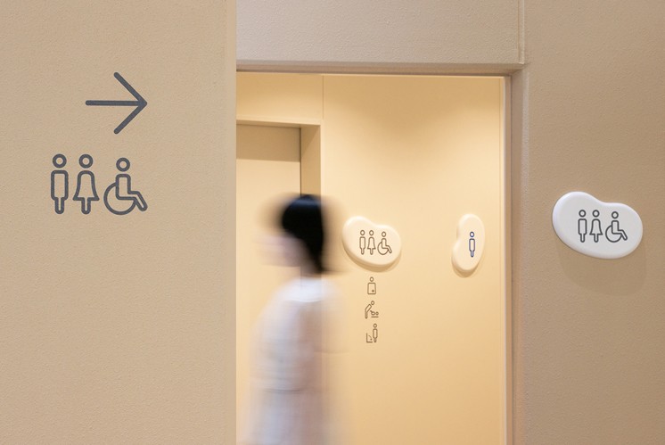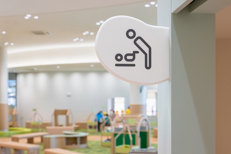 這套標識系統在空間中營造出統一且富有韻律的視覺效果,無論是大廳里承載地圖與功能說明的大型繭形導視牌,還是分布在各處的小型功能標識,柔和的線條與溫暖的色彩相互配合,給人以連貫且舒適的視覺體驗。對于兒童而言,圓潤的形狀消除了尖銳感帶來的距離感,能激發他們的好奇心與親近感;對于家長及其他使用者,這種細膩的設計則傳遞出場所的用心,使整個空間顯得友好且富有溫度,即便在陌生的環境中,也能通過這些 “蠶繭” 標識輕松找到方向,感受到空間的包容性。