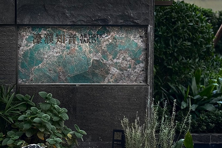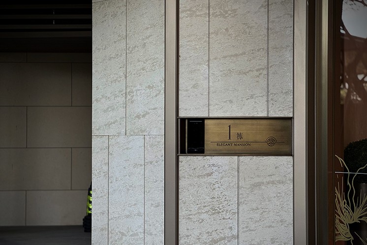 從踏入住宅的第一眼起,瑧山府的標識系統便以 “藝術觀感” ,構建起山居的精神內核。古銅做舊的銘牌鑲嵌在大理石墻面上,金屬的復古質感,與石材的天然肌理相得益彰,讓訪客在視覺感知中,提前進入 “云山閑庭” 的詩意場景。