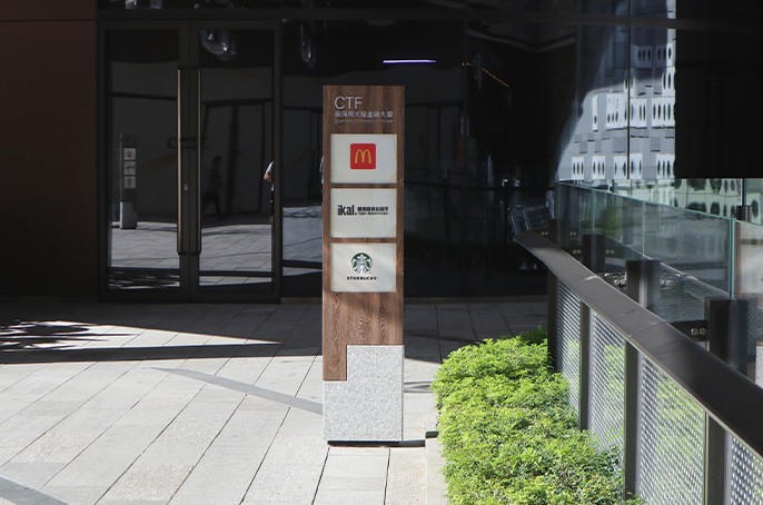 麥肯標識受邀為其標識導視服務,其設計巧妙地融合了石質與木質紋理,為現代金融地標增添了一份溫潤與雅致。導視牌的石質部分,選用上乘的天然石材,其紋理宛如歲月沉淀的詩篇,每一處木紋肌理都訴說著自然的鬼斧神工。石材的厚重質感與建筑的堅毅氣質相得益彰,仿佛是這座金融大廈穩固根基的象征,彰顯著一種堅不可摧的力量。
